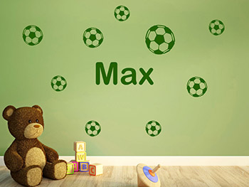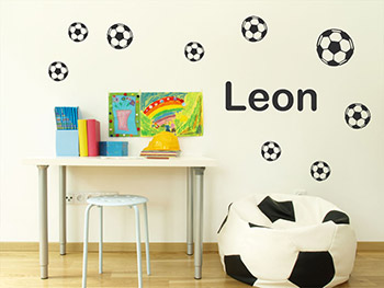 Ihr Kind begeistert sich für Fußball? Dann ist das Wandtattoo Fußbälle mit Name genau das Richtige. Sie bekommen ein Fußball Set mit 10 Fußbällen in drei unterschiedlichen Größen. Dazu können Sie den Namen Ihres Kindes eintragen. So erhalten Sie ein ganz persönliches Fußball Wandtattoo, das jede Wand in ein Spielfeld verwandelt.