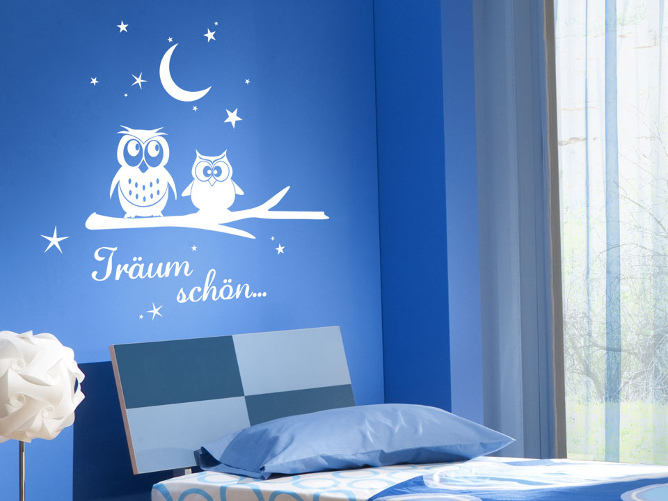 Schauen Sie sich unsere Motivansichten an und sehen Sie, dass man den Träumende Eulen Wandaufkleber mit dem "Träum schön" Spruch in verschiedenen Farben an die Wände bringen kann.