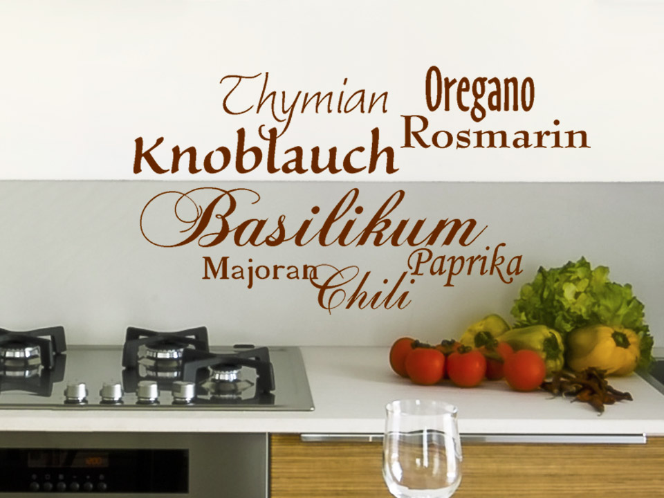 Das Wandtattoo Küchenkräuter & Gewürze kombiniert die Wörter Thymian, Knoblauch, Rosmarin, Oregano, Basilikum, Majoran, Paprika und Chili :