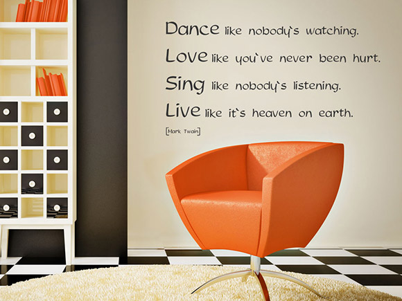 Das englische Wandtattoo Dance like... von Mark Twain beweist die poetische Kraft und Dynamik der englischen Sprache. Dazu kommt das auffallende Design des Wandaufklebers.